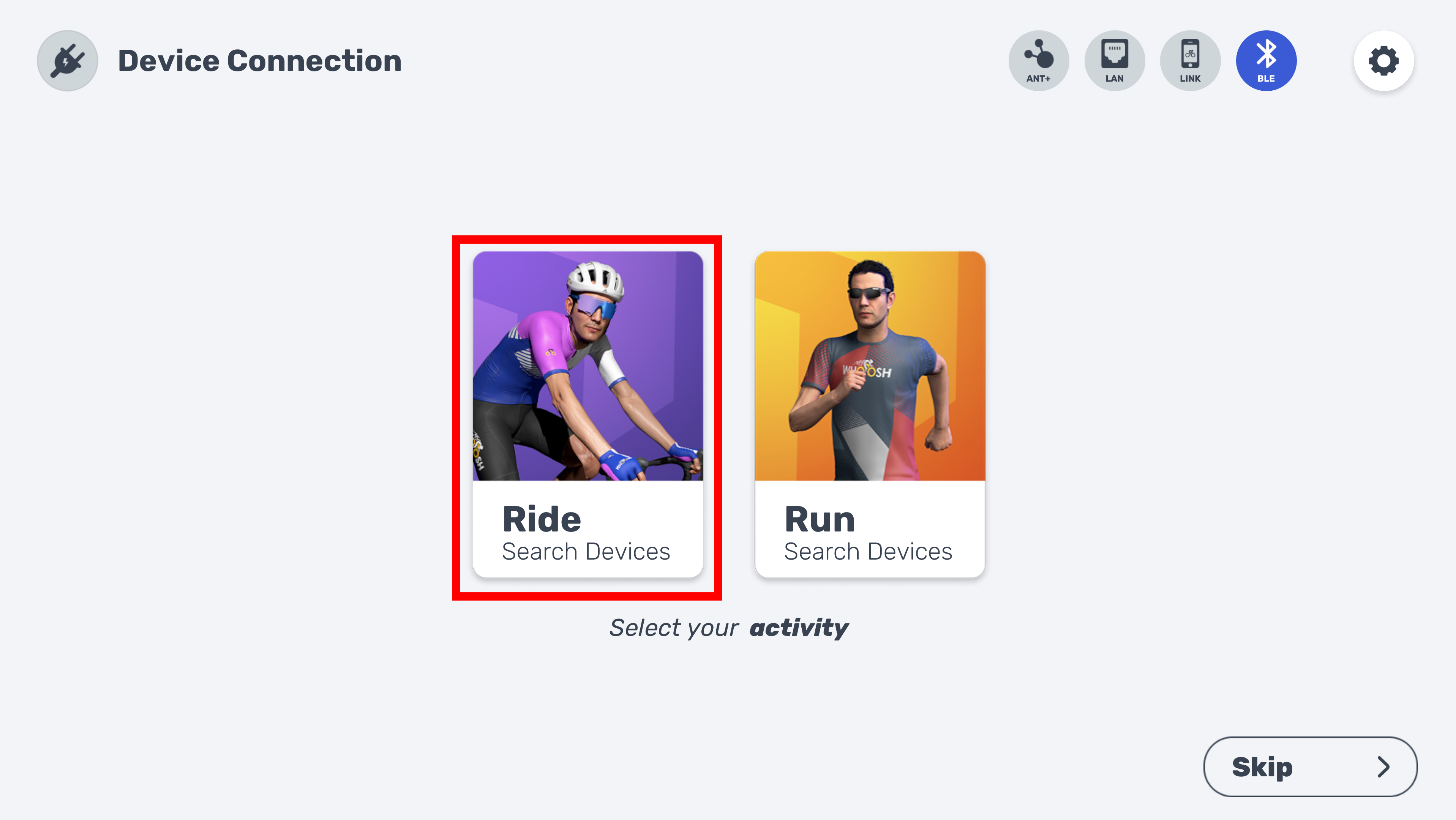 In the "Device Connection" screen, click on "Ride".